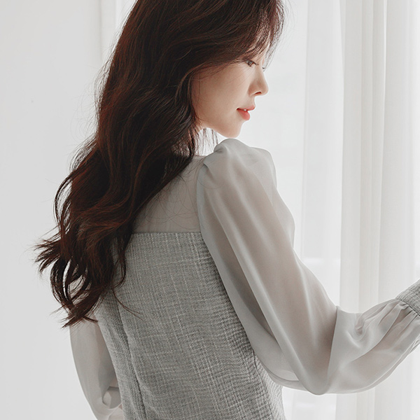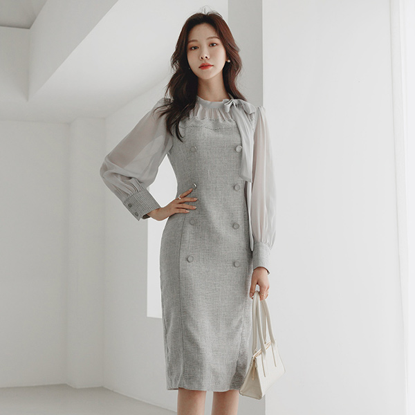 双 扣子 透视 蝴蝶结 褶皱 粗呢 连衣裙