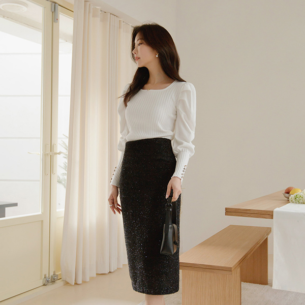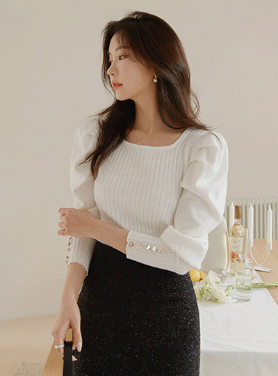 黄金 扣子 点缀 泡泡袖 肩膀 条绒 针织衫