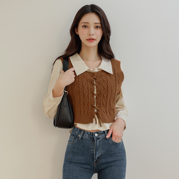 麻花 交叉 针织衫 马甲&퍼프셔츠 7分裤set