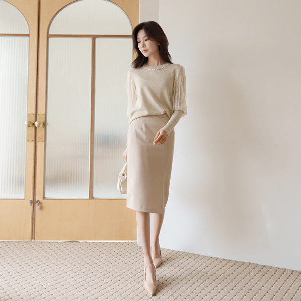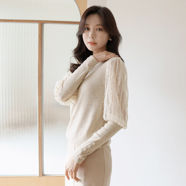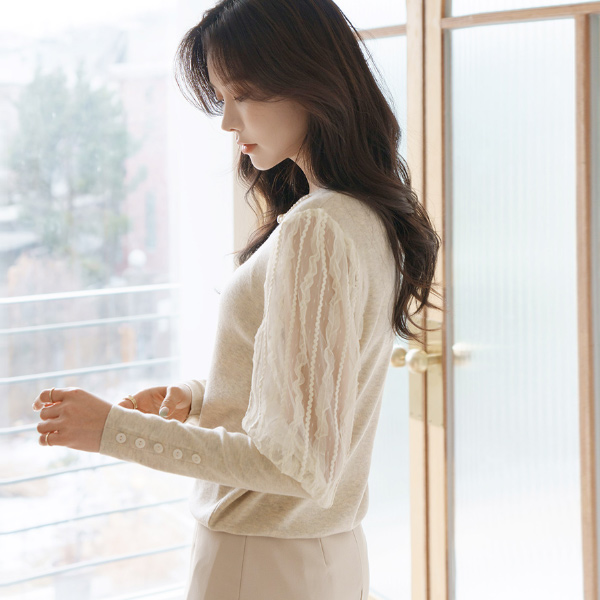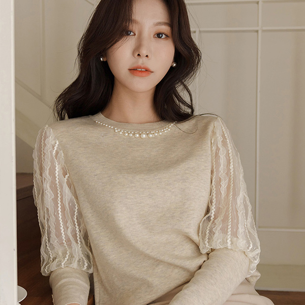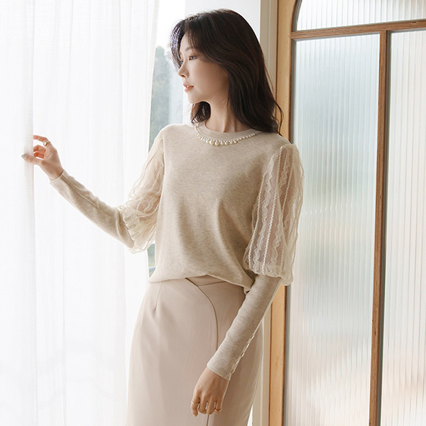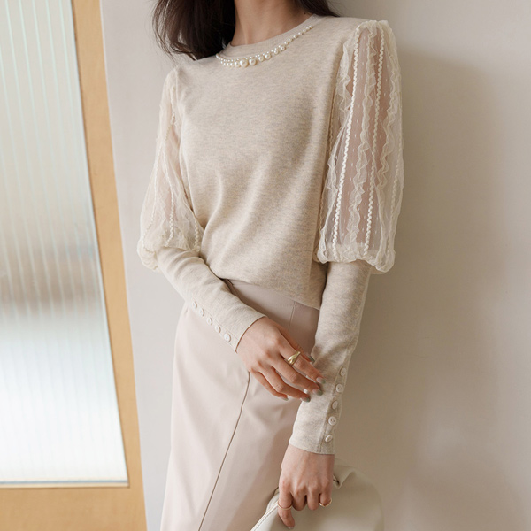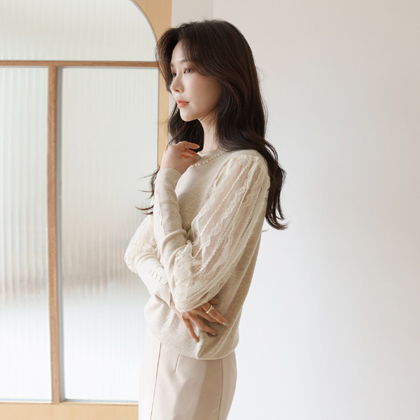 优雅 蕾丝 袖 珍珠 领 针织衫