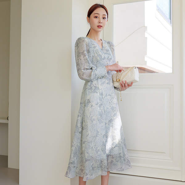 浪漫 花纹 雪纺 长款 连衣裙