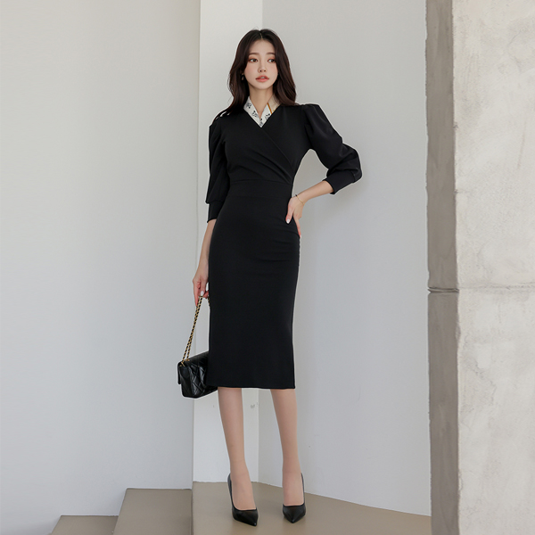 泡泡袖 细密 弹力 交叉式连衣裙