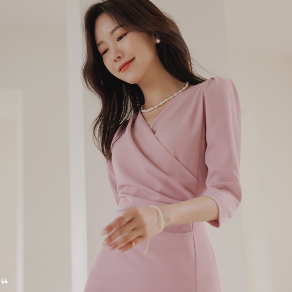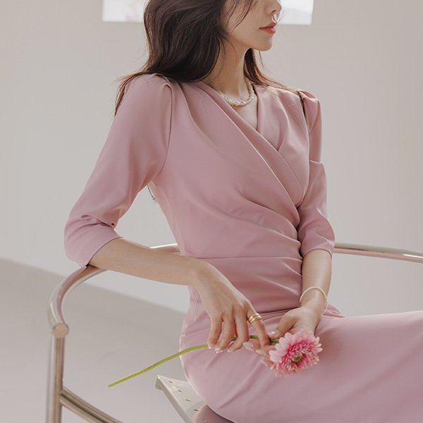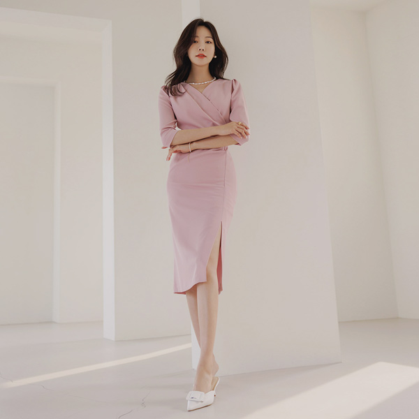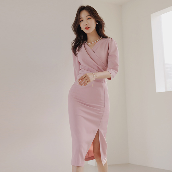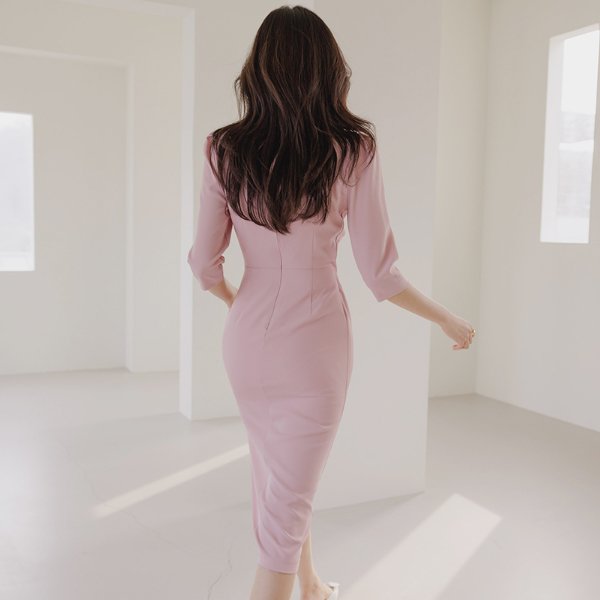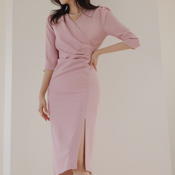 女性化的 侧纽 褶皱 开衩 连衣裙
