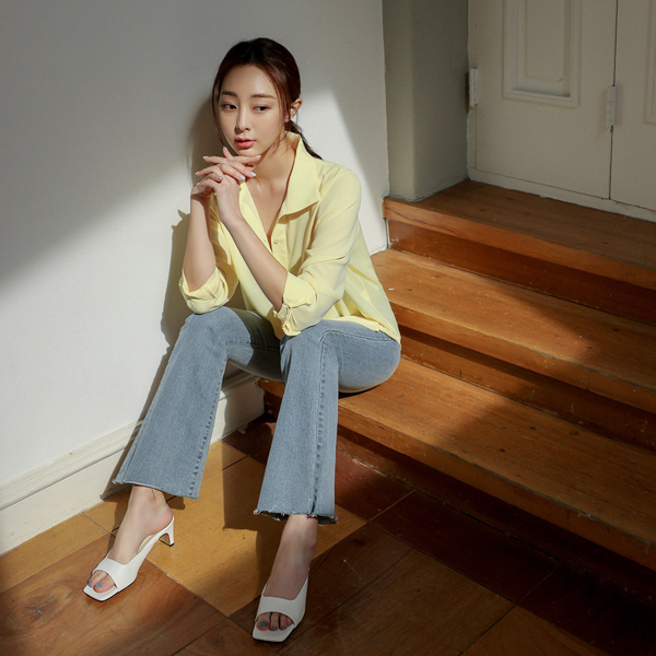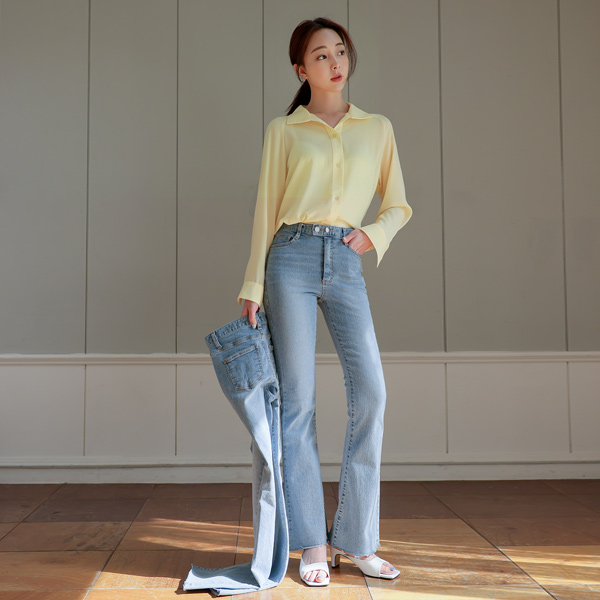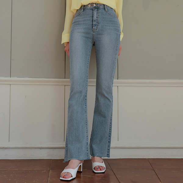 两扣 延长 水洗 喇叭 牛仔色 弹力 裤子