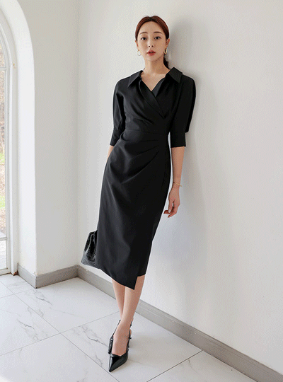 敞开式 领子 泡泡袖 袖 不规则 开衩 连衣裙