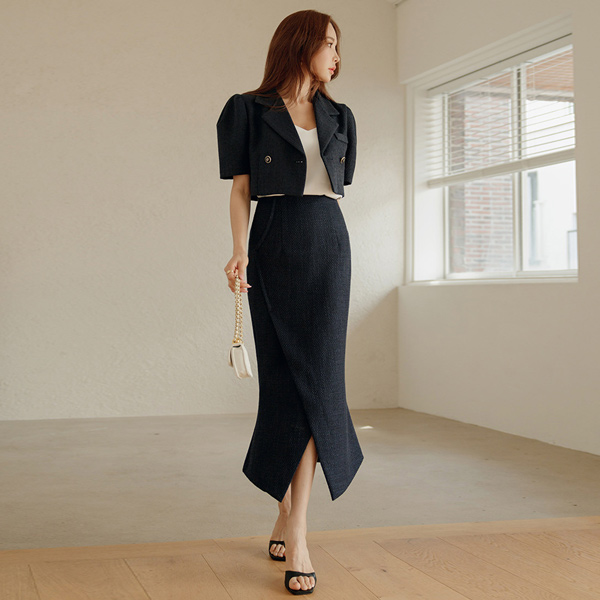 双 扣子 泡泡袖 袖 短 粗呢 夹克