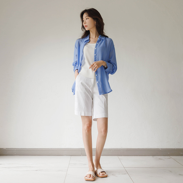 清凉 网纱 里面松紧带 亚麻 5分 裤子