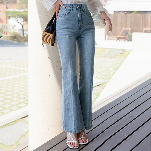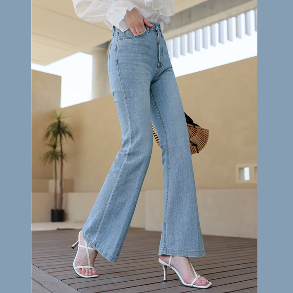 一字褶皱 休闲风格 喇叭 牛仔色 裤子