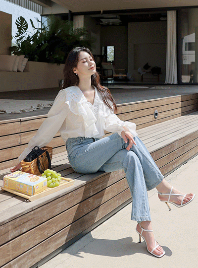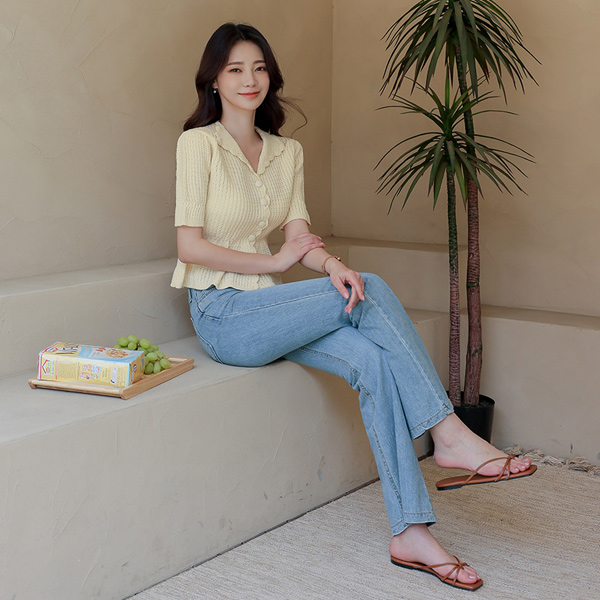 一字褶皱 休闲风格 喇叭 牛仔色 裤子