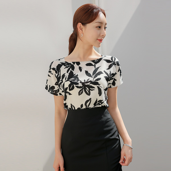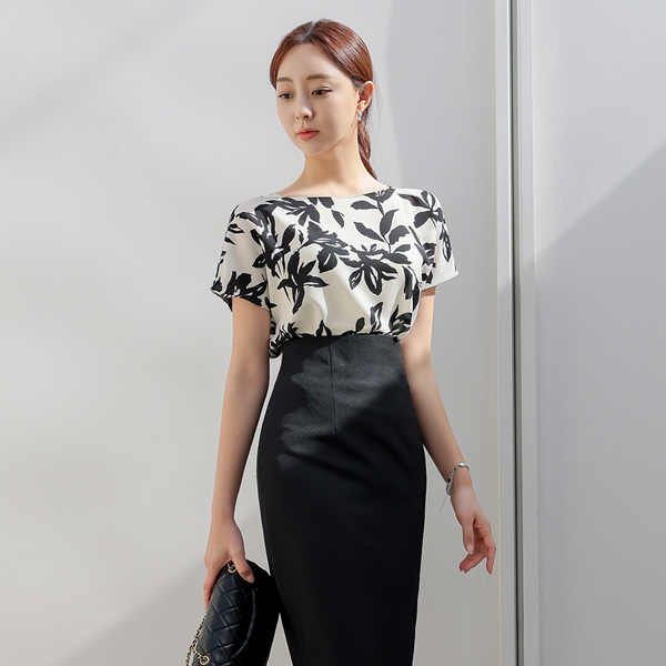 配色 花纹 船形领 罩衫
