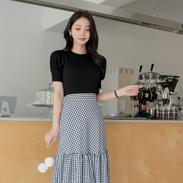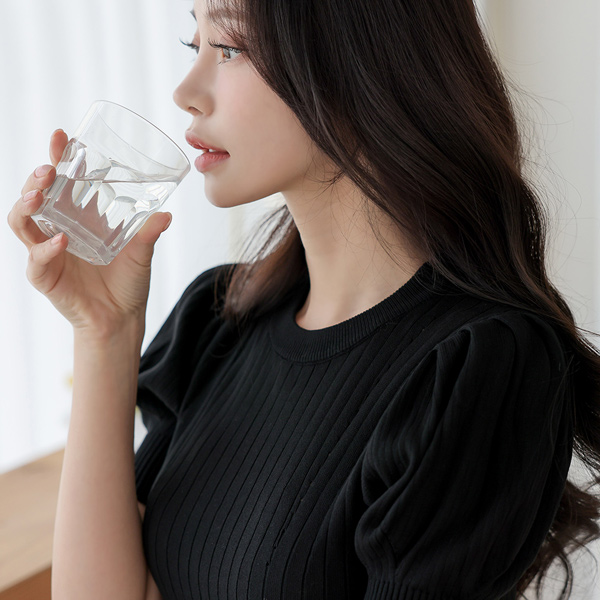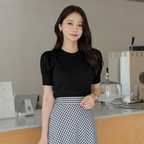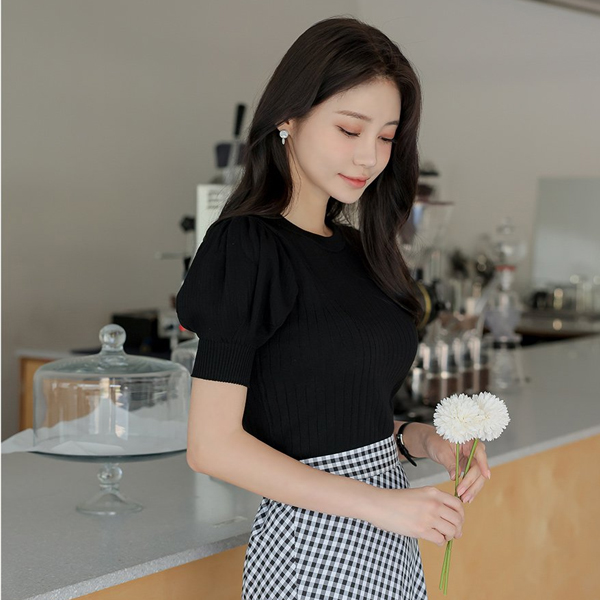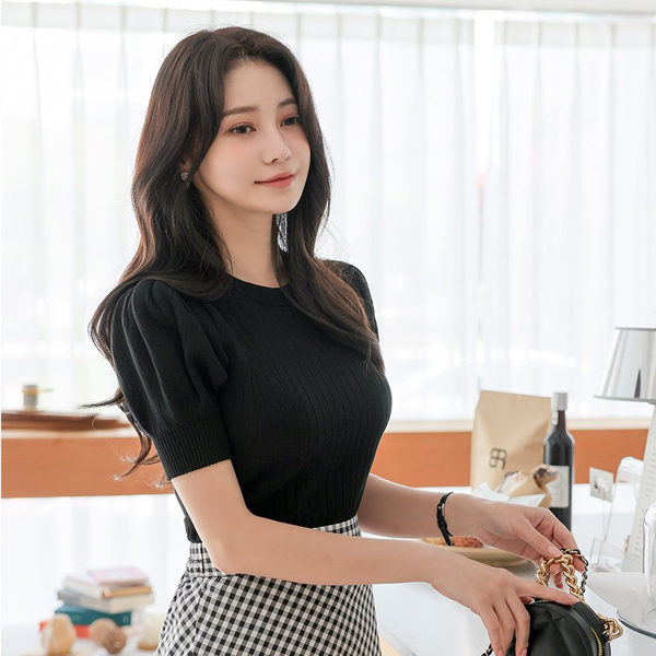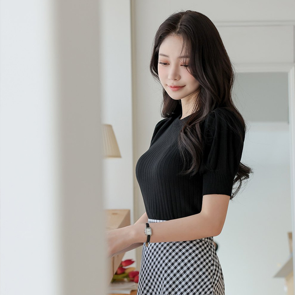 钻石纹 条绒 泡泡袖 袖 针织t恤
