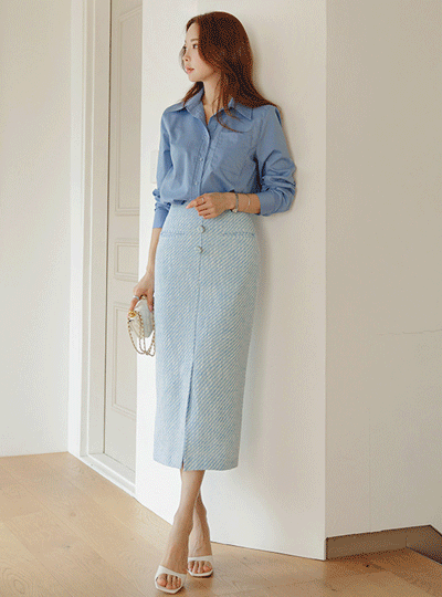 颜色 点缀 前 开叉 长款 粗呢 裙子