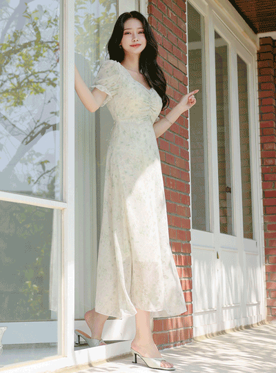 心形领 泡泡袖 雪纺 连衣裙