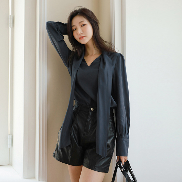 细褶 点缀 Eco 人造皮夹 炫酷 情调 短上衣 裤子