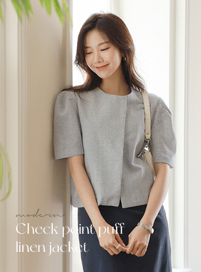 格子 图案 点缀 泡泡袖 亚麻 夹克