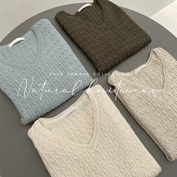 自然 V字领 亚麻 麻花 针织衫