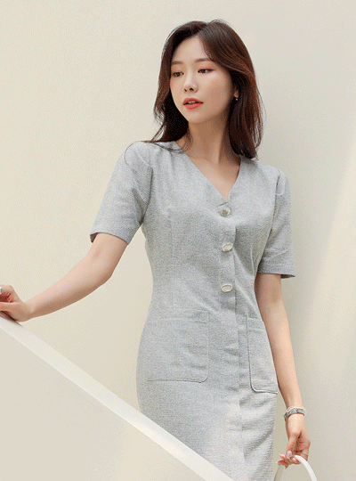 摩登 V字领 Silver 点缀 粗呢 连衣裙