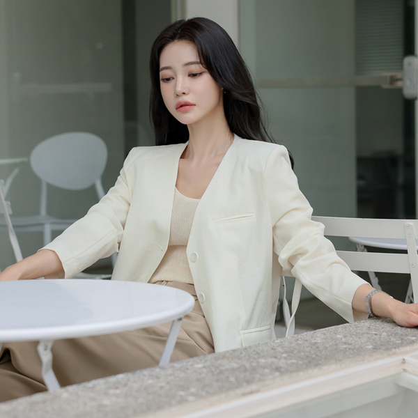 无领 两扣 亚麻 夹克
