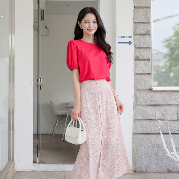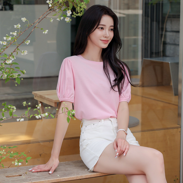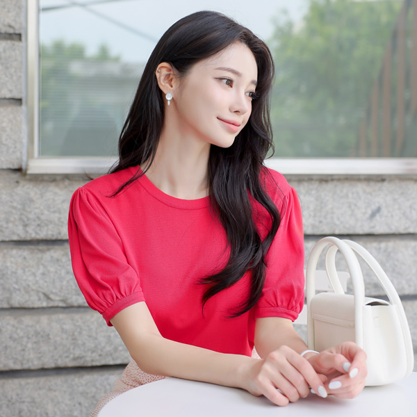鲜明 颜色 泡泡袖 袖 圆领 针织衫