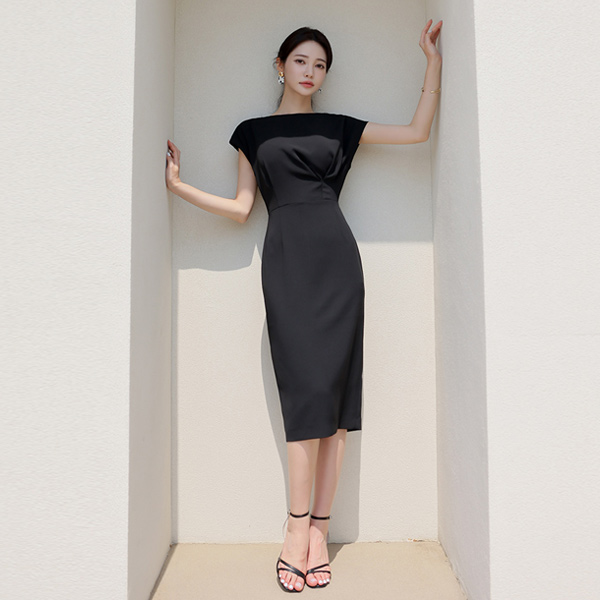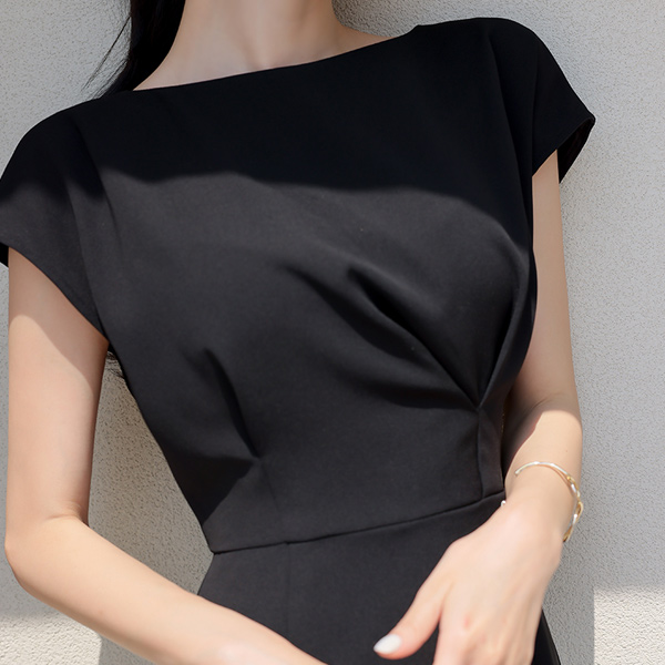 船形领 帽檐袖 侧纽 细褶 连衣裙