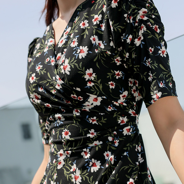 花纹 弹力 裹身 喇叭 连衣裙