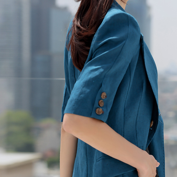 亚麻 缝线 双排扣 5分 袖 夹克