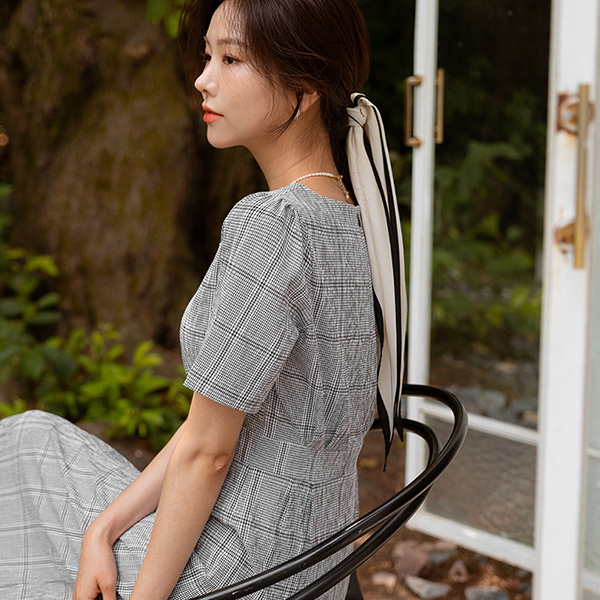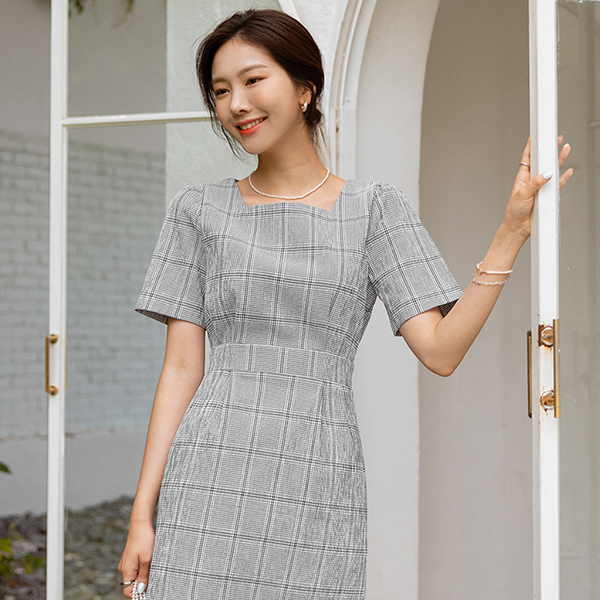 日常 方形 领 格子 连衣裙