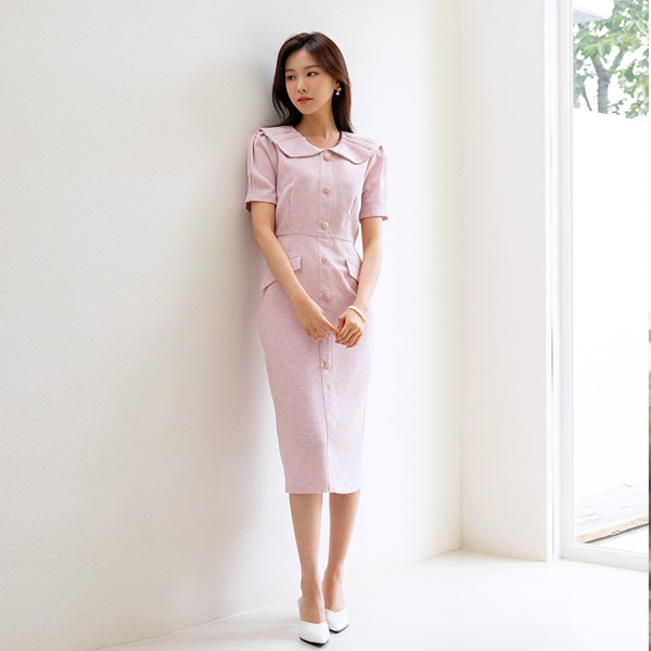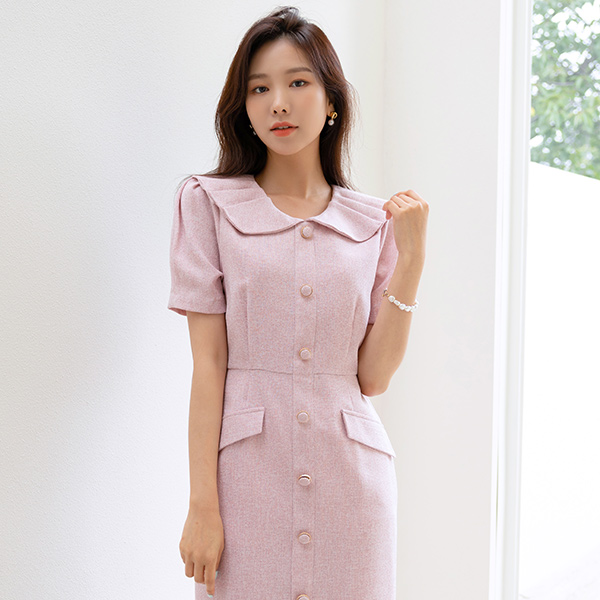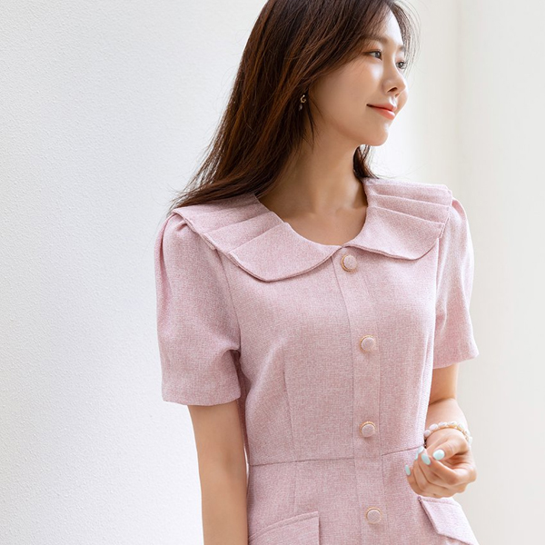 可爱 领子 细褶 点缀 H字型 粗呢 连衣裙