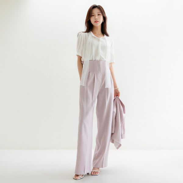 点缀 细褶 粗呢 后侧松紧带 宽松 宽松长裤