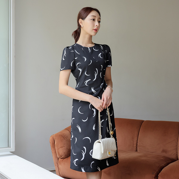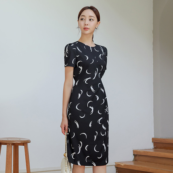 配色 绘图 侧纽 细褶 连衣裙