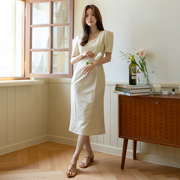 沙沙响 摩登 法式 方形 领 泡泡袖 长款 连衣裙