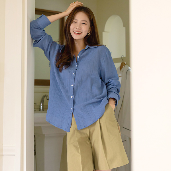 颜色 点缀 宽松 亚麻 褶皱 衬衫