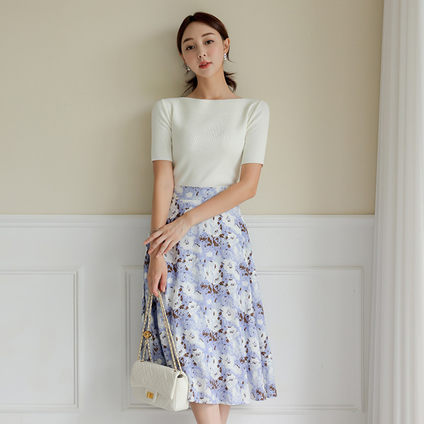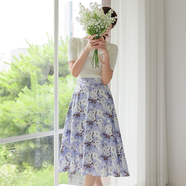 亚麻 后侧松紧带 大理石 喇叭 裙子