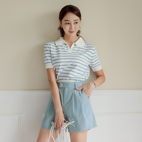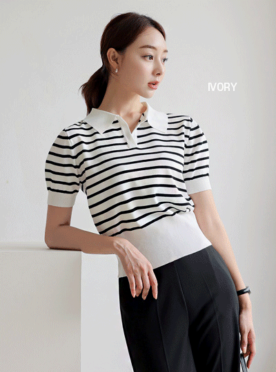 条纹 敞开式 翻领 针织t恤