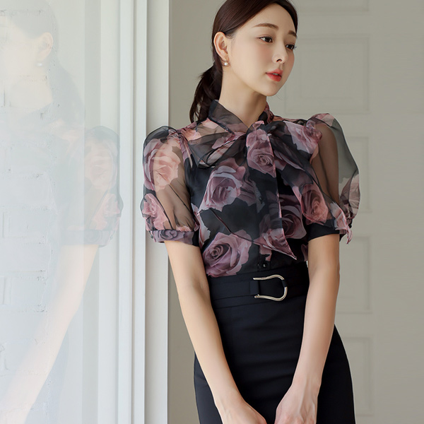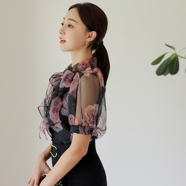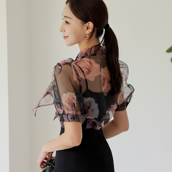玫瑰 透明硬纱 蝴蝶结领结 泡泡袖 罩衫