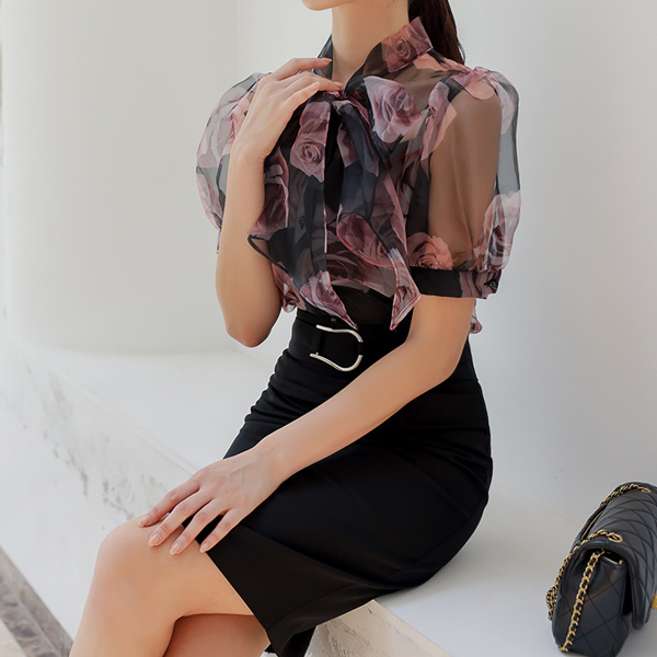 玫瑰 透明硬纱 蝴蝶结领结 泡泡袖 罩衫