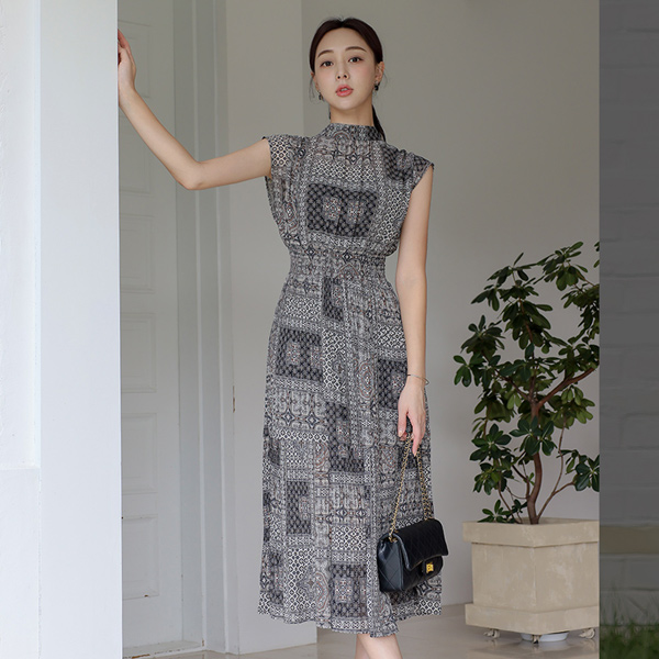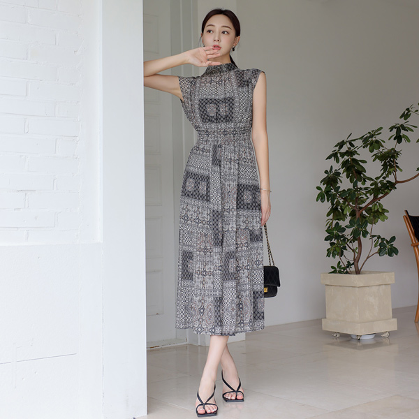 半高领 民族风 松紧带 褶边 连衣裙&背心 set
