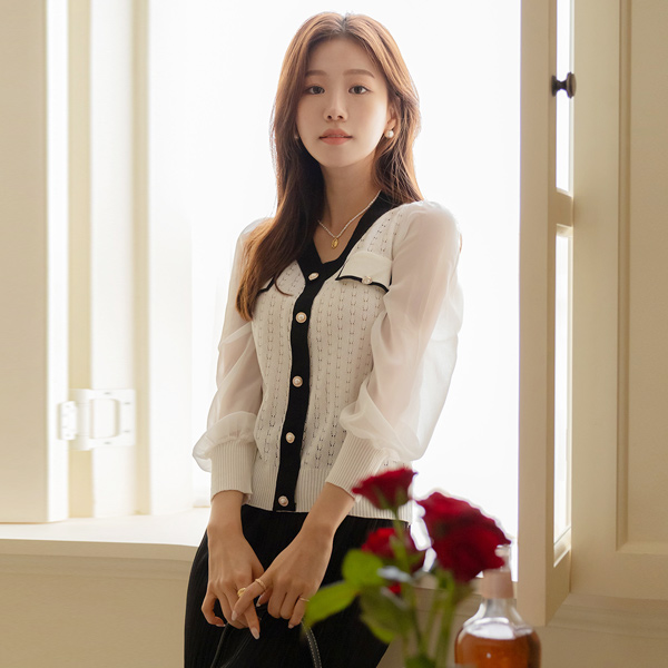 优雅 雪纺 透视 袖 珍珠扣 针织衫