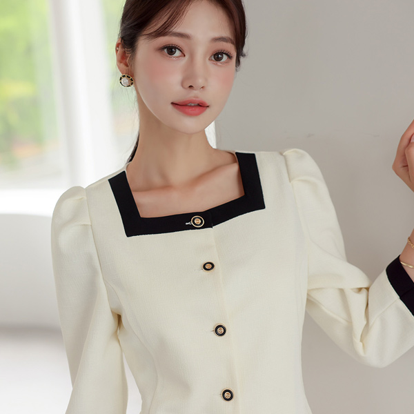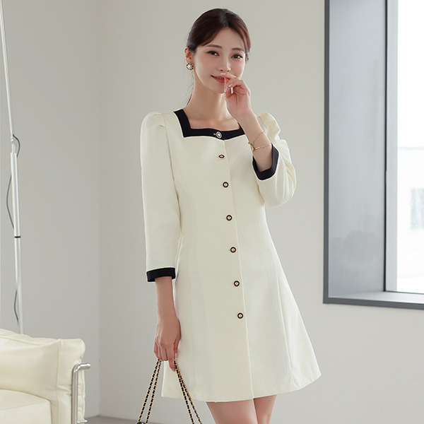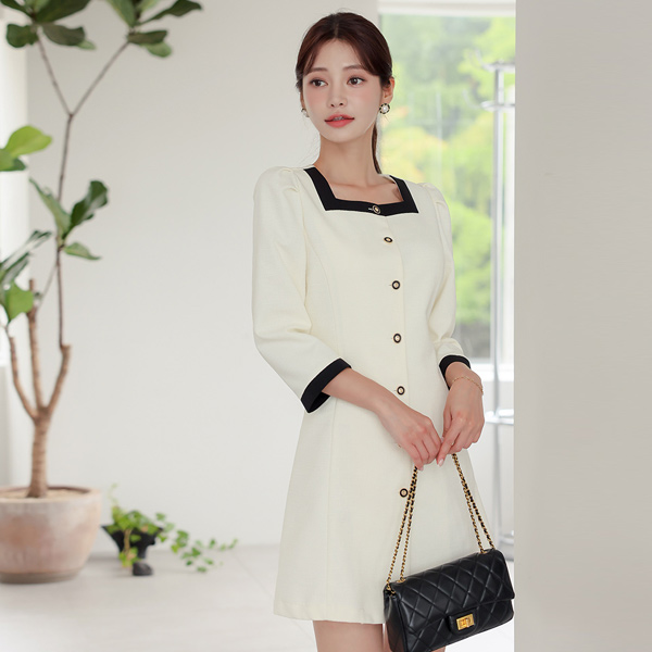 配色 方领 粗呢 迷你 连衣裙