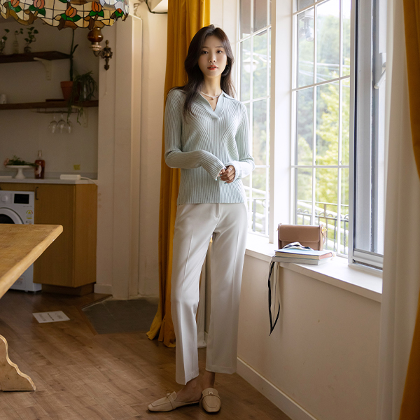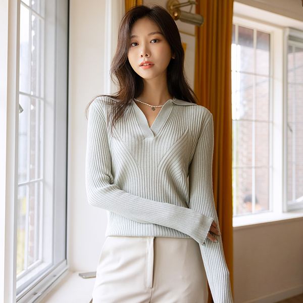 柔丝 触摸 半开 领子 条绒 针织衫