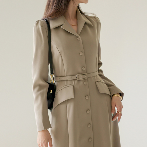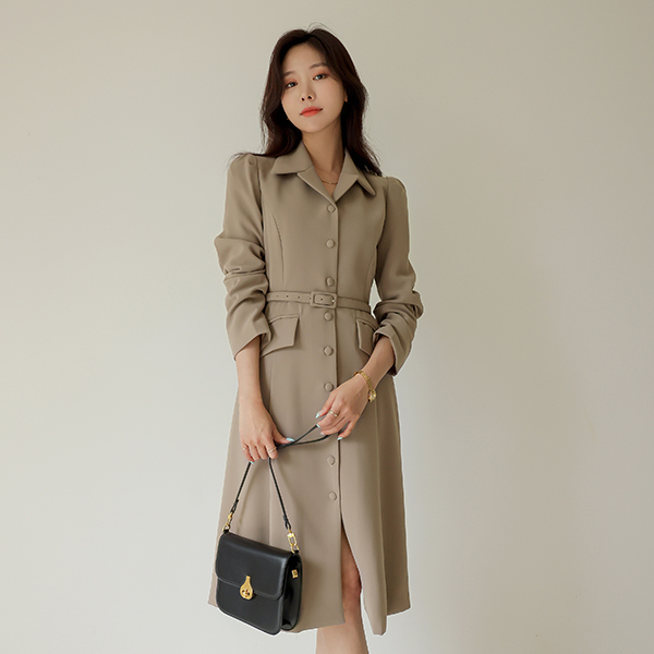 修身 领子 A字型 连衣裙 (腰带SET)