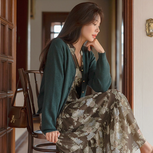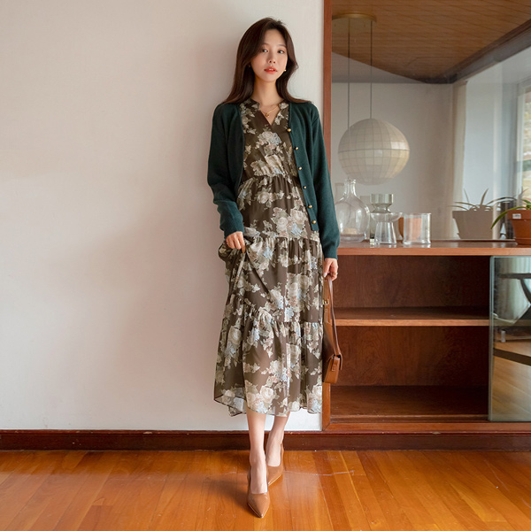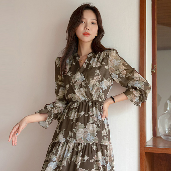 浪漫 花纹 雪纺 V字领 长款 连衣裙