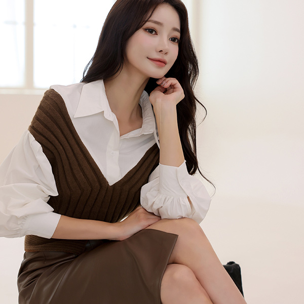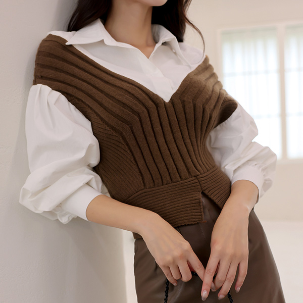 露肩 针织衫 马甲 分层 泡泡袖 衬衫
