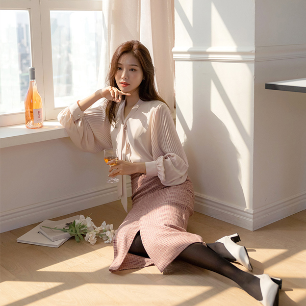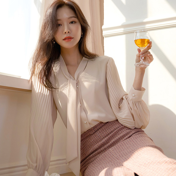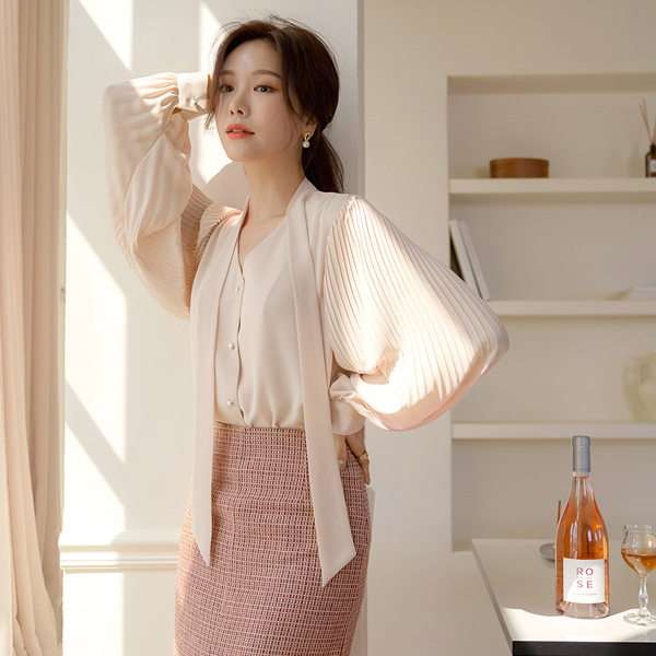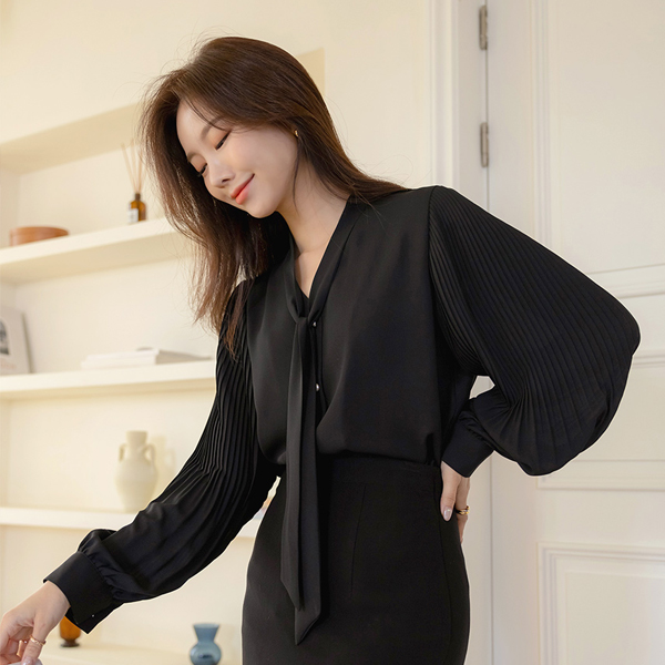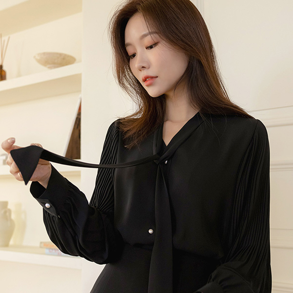 褶边 曲线 袖 珍珠 扣子 领带 罩衫