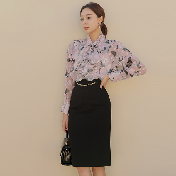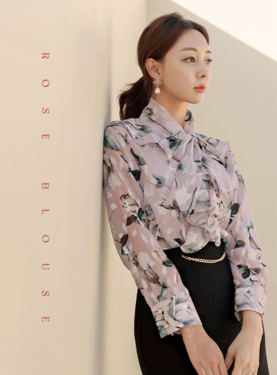 玫瑰 透视 褶裥 领带 罩衫