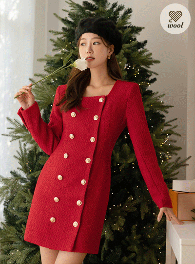 Holiday 金色纽扣 粗呢 羊毛 连衣裙