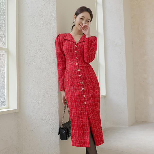 闪亮 单领 丝绒 粗呢 长款 连衣裙