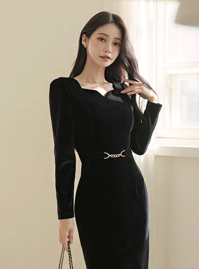 丝绒 心形领 黄金 链条 腰带 装饰 斯利姆 连衣裙