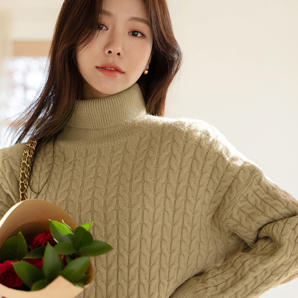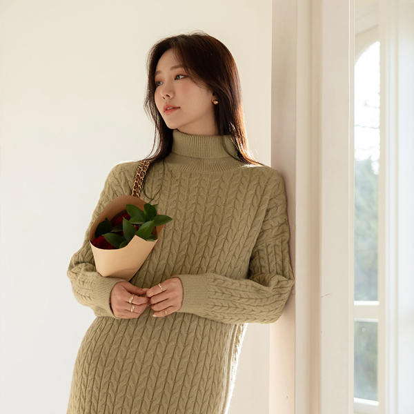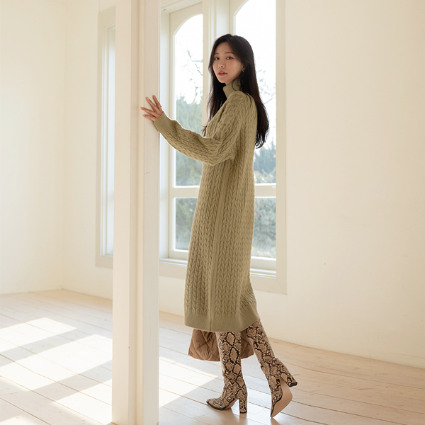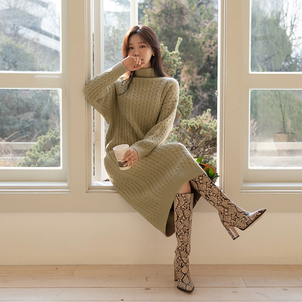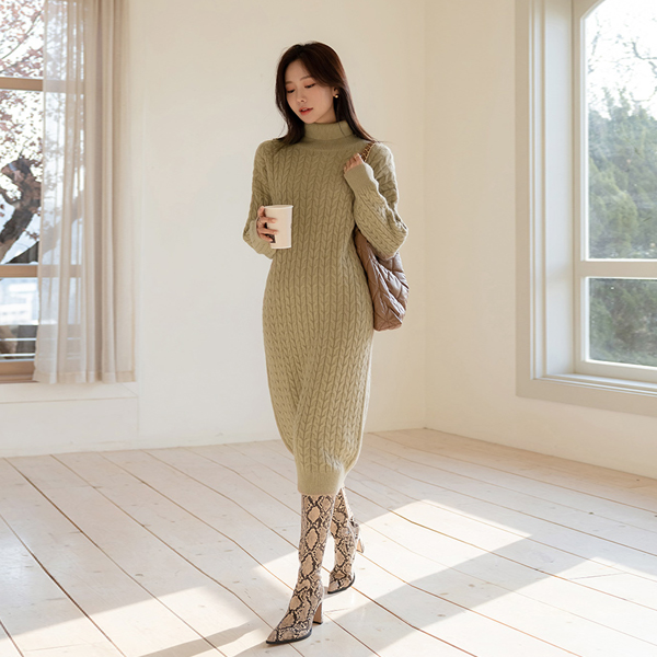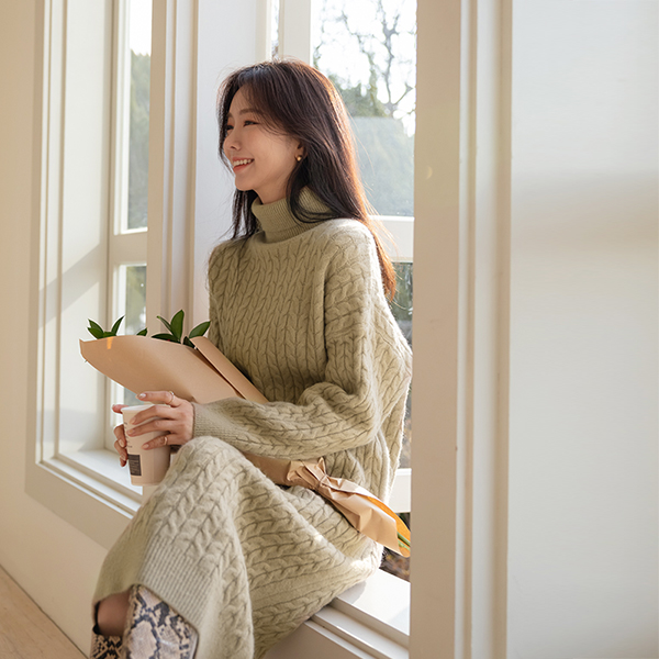 柔软 缆绳 高领 针织衫 长款 羊毛 连衣裙