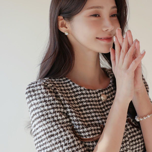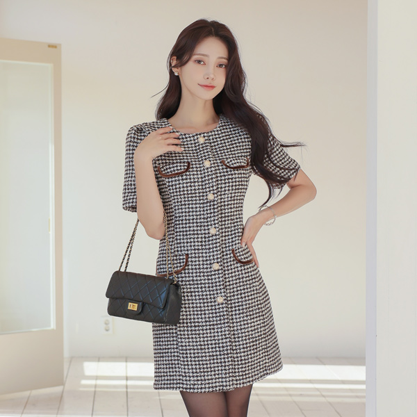 甜美地 犬牙 格子 粗呢 金色纽扣 迷你 连衣裙